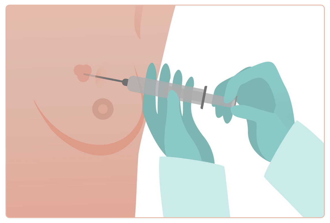 این روش ساده ترین نوع بیوپسی پستان است. در این روش که برای ارزیابی توده های احساس شده در معاینه بالینی مورد استفاده قرار می گیرد، بیمار بر روی یک تخت دراز می کشد و پزشک یک ماده بی حس کننده به محل نمونه برداری تزریق می کند. پس از بی حس شدن کامل ناحیه مورد نظر، سوزن نازکی که به یک سرنگ متصل است به بافت سینه وارد شده و نمونه ای از سلول ها یا مایعات را از داخل توده جمع آوری می شود. در انتهای کار نیز یک گاز استریل بر روز محل نمونه برداری شده قرار داده می شود.